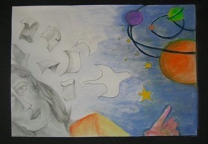 Die Schüler gestalten nach einem Besuch der „Fondation Folon“ im Examen ein Selbstportrait, in dem sie Bezug auf den Besuch und ein Zitat Folons nehmen.
